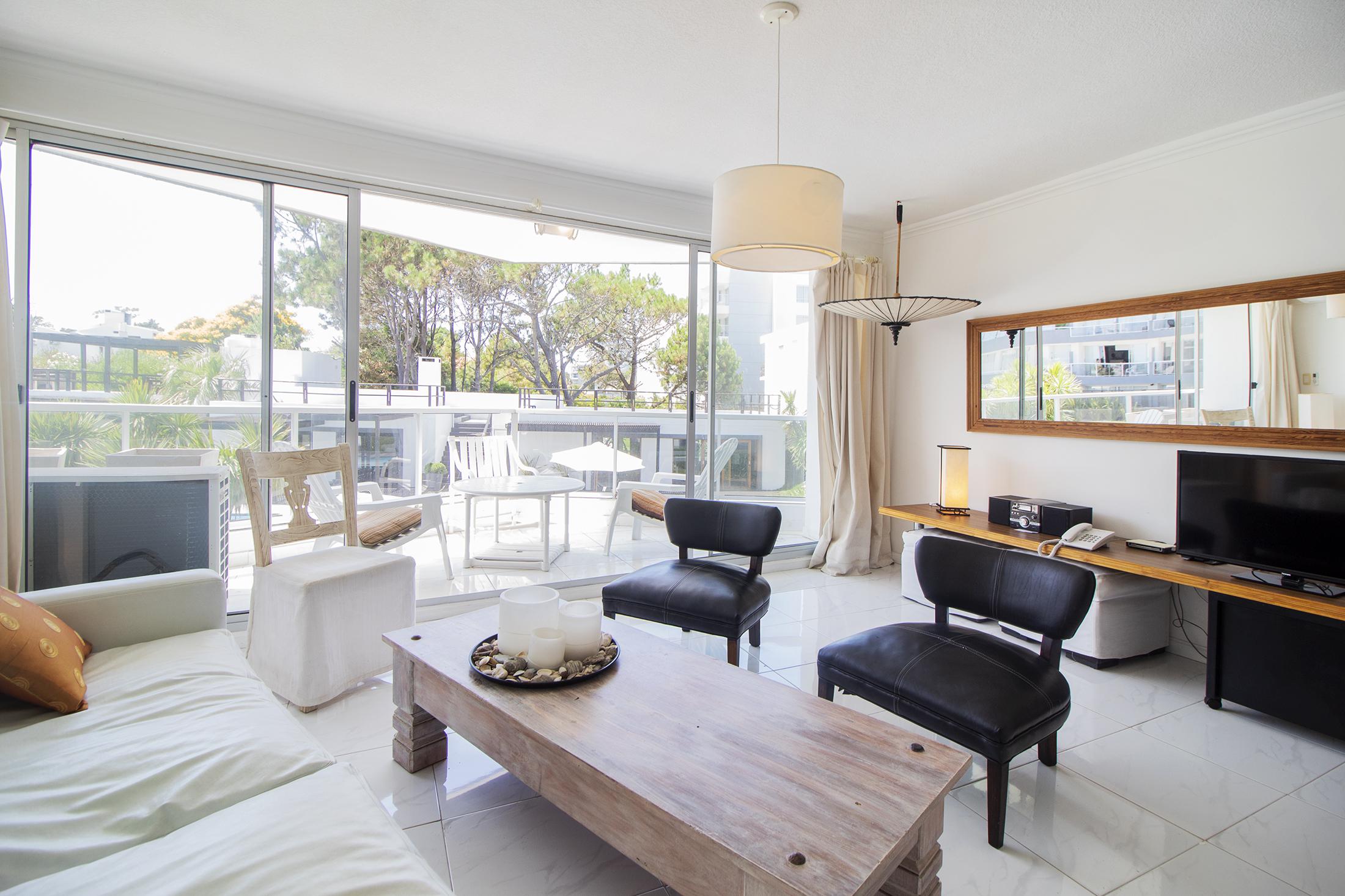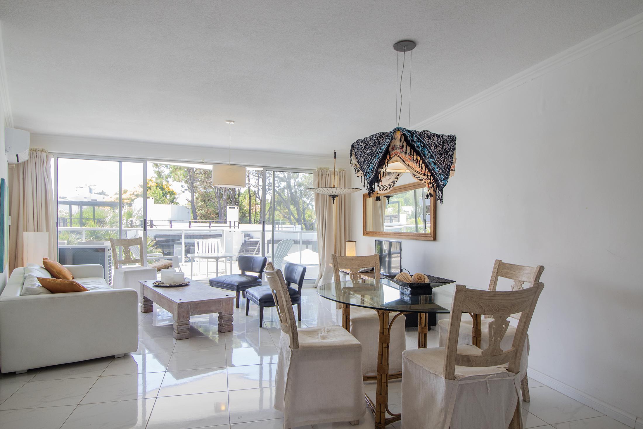 Living comedor integrado ; terraza con hueco de vista hacia el mar.